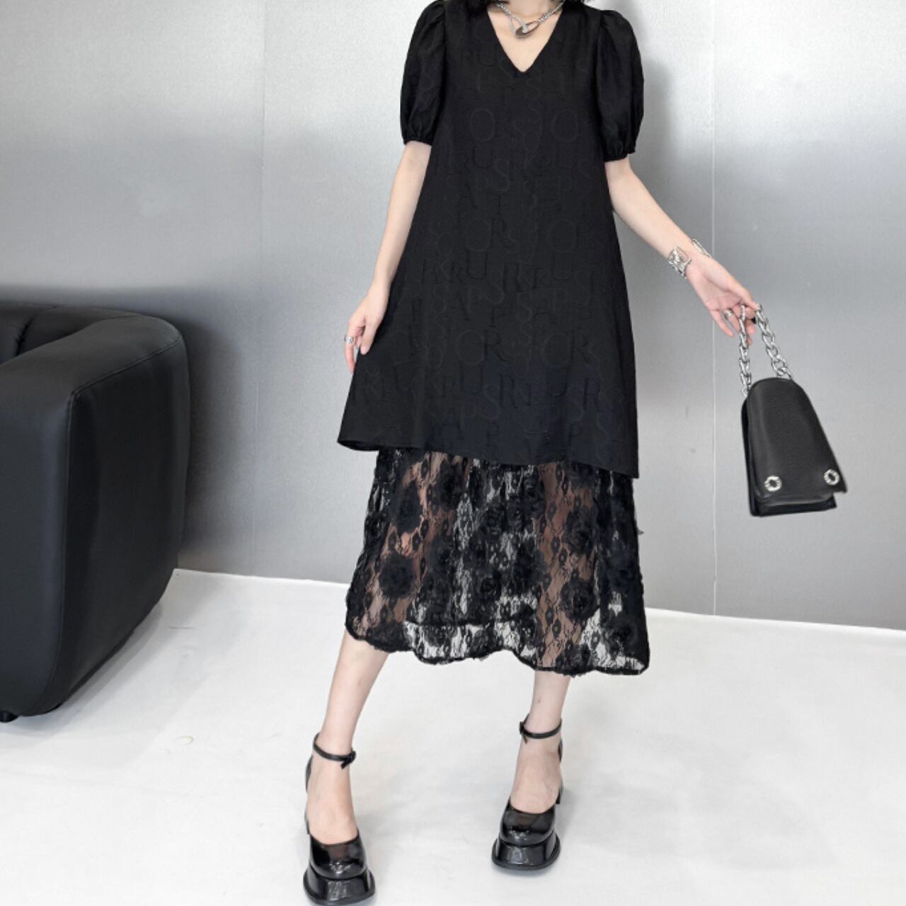 立体的な花柄レースとパフスリーブが特徴のレイヤード風ドレス