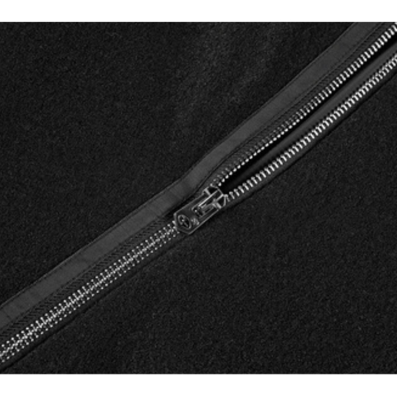 アシンメトリーなジップデザインと独特なカッティングが特徴のモード系ロングジャケット
